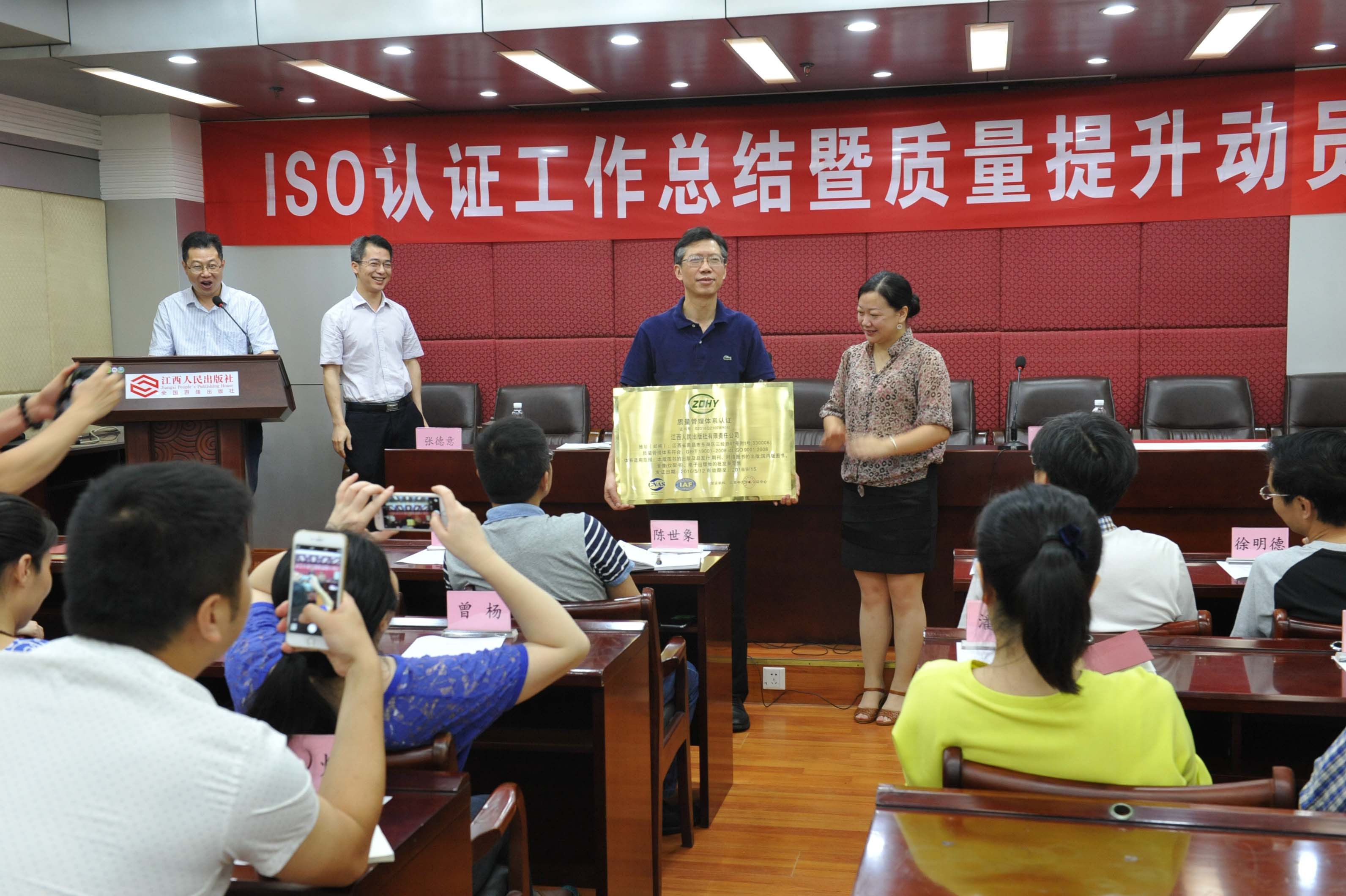 6月17日,江西人民出版社隆重举行ISO9001认证工作总结暨质量提升动员会。据悉,江西人民出版社是全国百佳出版社,是目前国内为数不多通过该体系认证的出版社,在浙江省8家出版社中尚属首家。