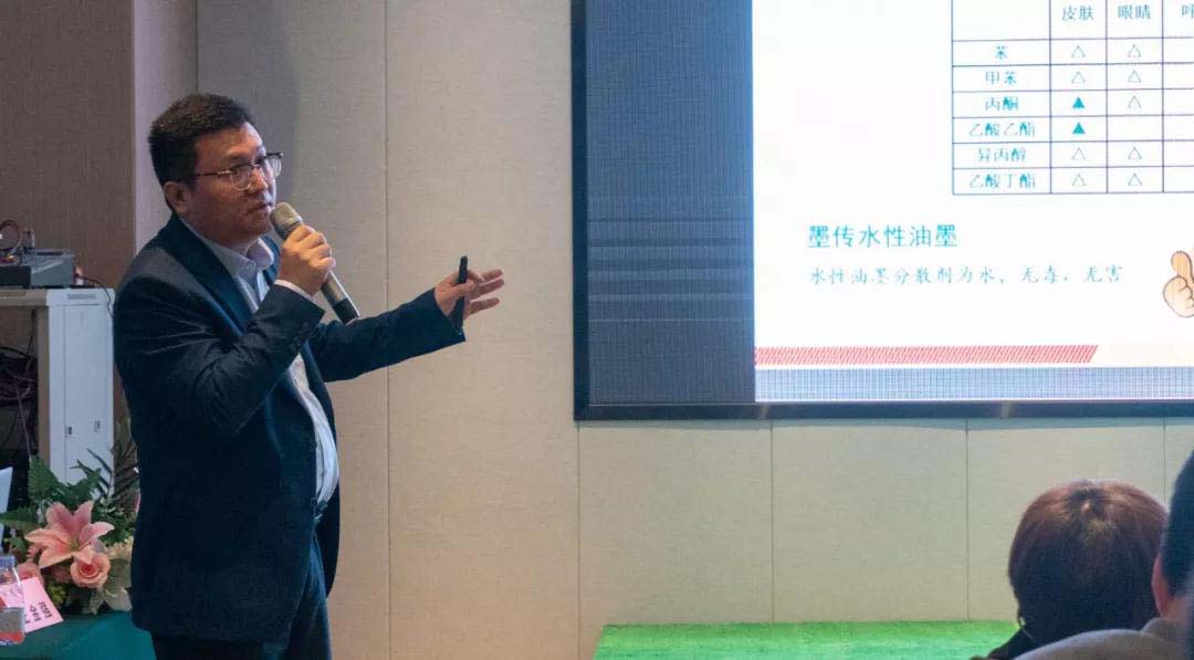 上海墨传新材料科技有限公司总经理李勇峰博士讲解了已通过最新标准(环境标志技术要求JH371-2018)环境标志认证的水性油墨的应用技术及相关注意事项。